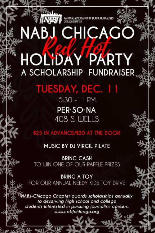 It’s that time! The Chicago chapter of NABJ will host their annual Red Hot Holiday Party on Tuesday, December 11, 2018, from 5:30 PM – 11:00 PM at Persona Lounge.