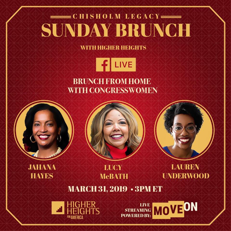 On Sunday, March 31st, Higher Heights hosted a special virtual Sunday Brunch to celebrate the late Shirley Chisholm’s legacy featuring a conversation with newly elected Congresswomen Jahana Hayes (CT-5), Lucy Mcbath (GA-6), and Lauren Underwood (IL-14)—and I was one of the virtual hosts!